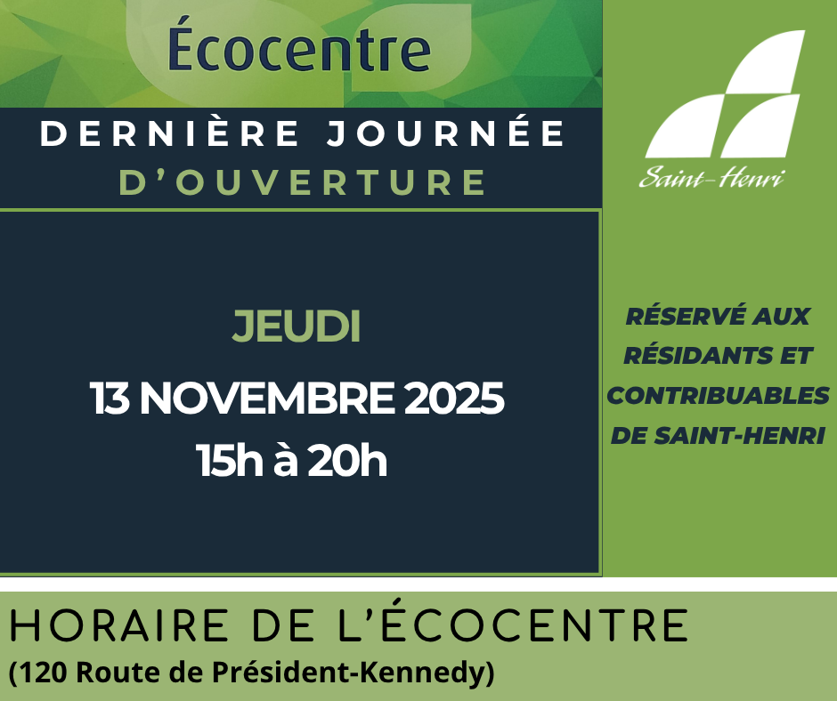 Date 13 Nov 2025 Heure 15 h 00 min - 20 h 00 min Fermeture de l’écocentre Partagez cet événement + Ajouter à mon Agenda Google + iCal / Outlook export 00 jours 00 heures 00 minutes 00 secondes