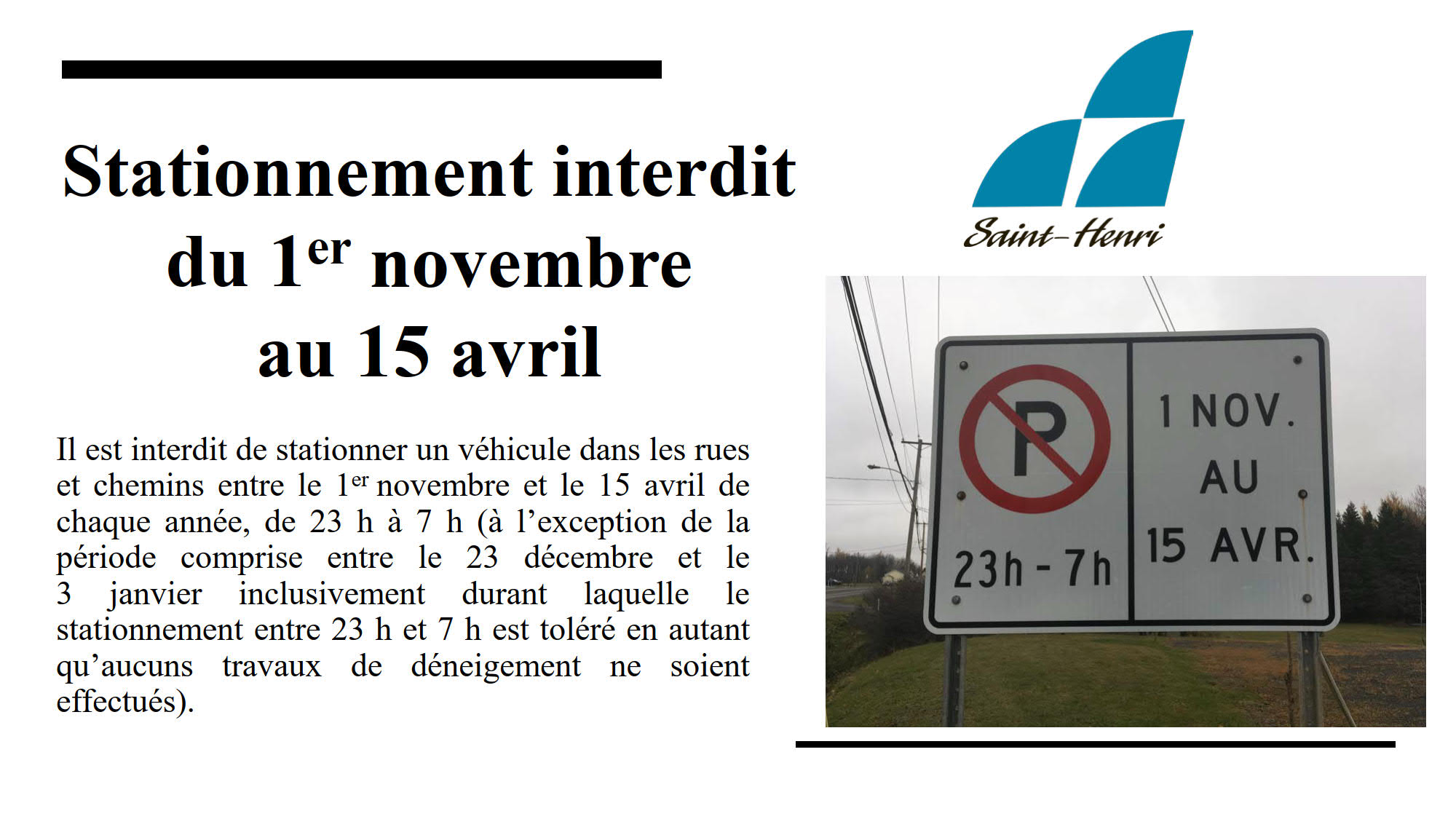Nous vous rappelons que le stationnement dans les rues et chemins est interdit du 1er novembre au 15 avril de chaque année, de 23h à 7h (à l’exception de la période comprise entre le 23 décembre et le 3 janvier inclusivement durant laquelle le stationnement entre 23h et 7h est toléré en autant qu’aucuns travaux de déneigement ne soient effectués).